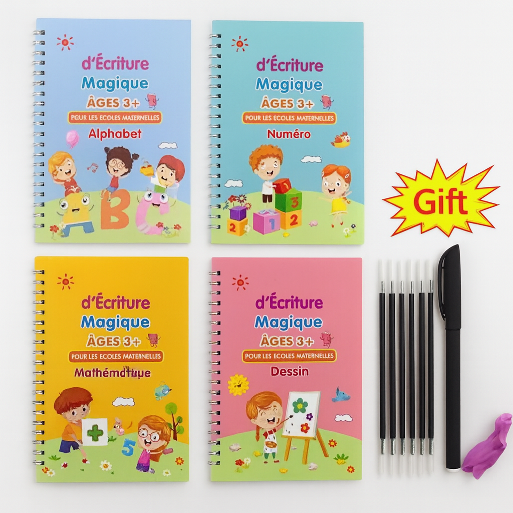 WAOUH ! Notre nouveau livre magique pour "apprendre à écrire en 28 jours".Réutilisable : Notre encre Magique Calligraphie disparaît après quelques minutes seulement !Pédagogique : Apprenez l'alphabet, la cursive, les chiffres et d'autres activités !Innovant : Apprenez à écrire avec les DEUX MAINS !Économisez de l'argent: Ne dépensez plus en matériel consommable pour les cahiersAmusant: Une pléthore de jeux pour garder votre enfant loin des gadgetsCréatif: Un monde d'histoires, de couleurs et d'aventures